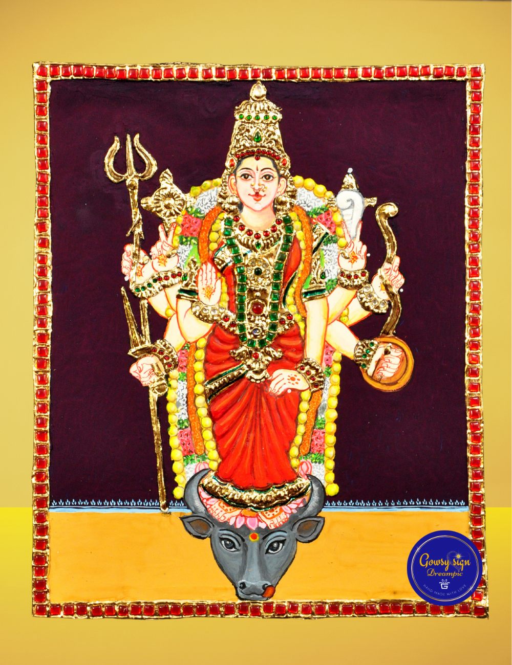 Celebrate the fierce and victorious form of Goddess Mahishasuramardini with this stunning Tanjore painting, inspired by the divine depiction worshipped in Chidambaram temple. This sacred artwork captures the powerful moment where Devi Durga triumphs over the demon Mahishasura, symbolizing the victory of dharma over adharma.