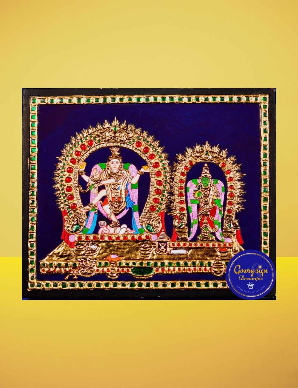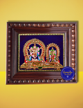 Immerse yourself in the divine magnificence of Lord Natarajar, the eternal cosmic dancer, alongside Goddess Sivakami Ambal, the embodiment of grace and devotion. Inspired by the revered Chidambaram temple, this grand Tanjore painting is a masterpiece of sacred South Indian art.