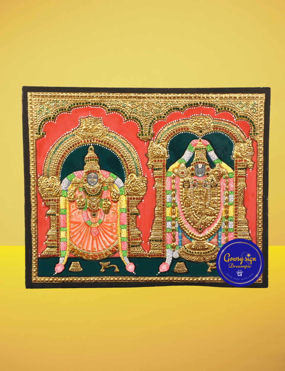 Invoke the divine blessings of Lord Venkateswara (Tirupati Balaji) and Goddess Alamelu Ammal (Padmavati Devi) with this majestic Tanjore painting, an embodiment of prosperity, devotion, and eternal love. Lord Balaji stands in his iconic posture adorned with sacred ornaments, beside Goddess Alamelu, radiating grace and benevolence.