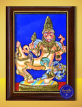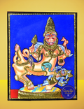 Handcrafted using traditional Tanjore painting techniques, this artwork is rich with 24k gold foil detailing, vibrant colors, and embossed textures that enhance its divine presence. A truly unique piece, this painting is revered for its protective energy and mythological depth.