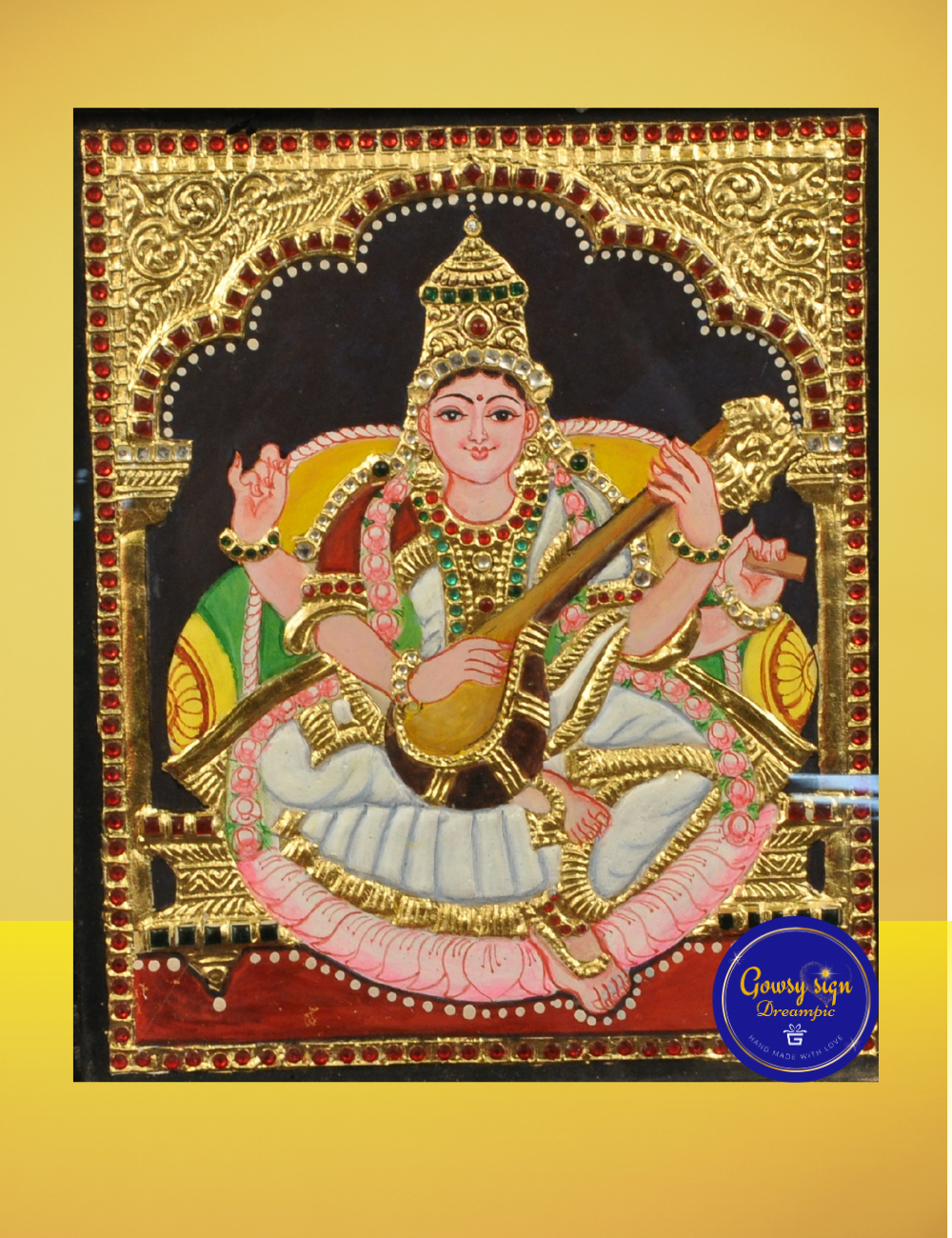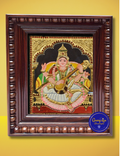 Handcrafted in the traditional Tanjore art style, this painting is richly adorned with authentic 24k gold foil, natural pigments, and detailed embossing, making it a powerful symbol of purity i4ntellect. Ideal for homes, study rooms, schools, or gifting during Saraswathi Pooja and Navaratri, this masterpiece reflects cultural beauty and spiritual energy.