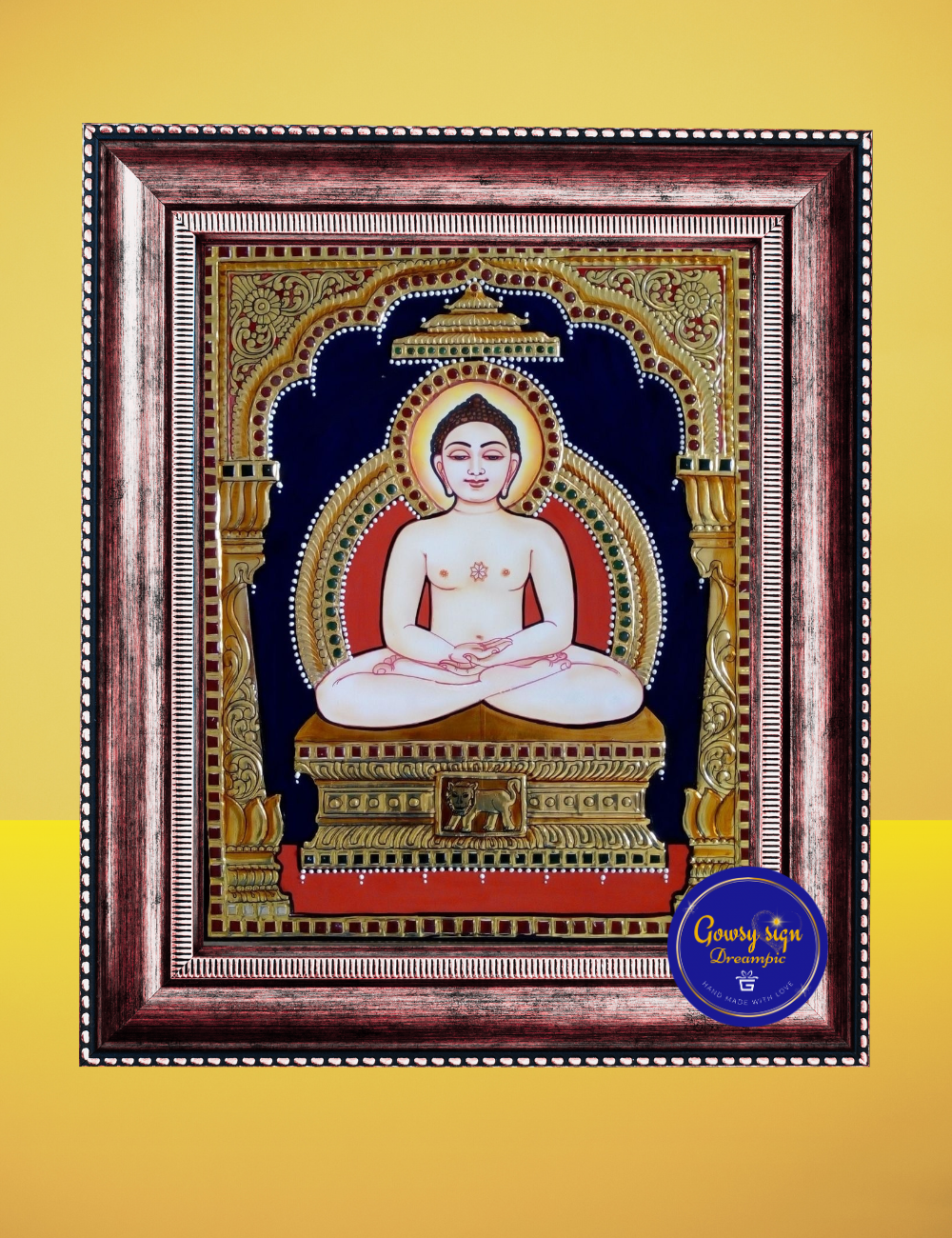 Embrace inner peace and spiritual strength with this exquisite Tanjore painting of Lord Mahaveer, the revered 24th Tirthankara in Jainism. Handcrafted in the time-honored Tanjore art style, this painting brings divine grace and timeless tradition to your sacred space.
