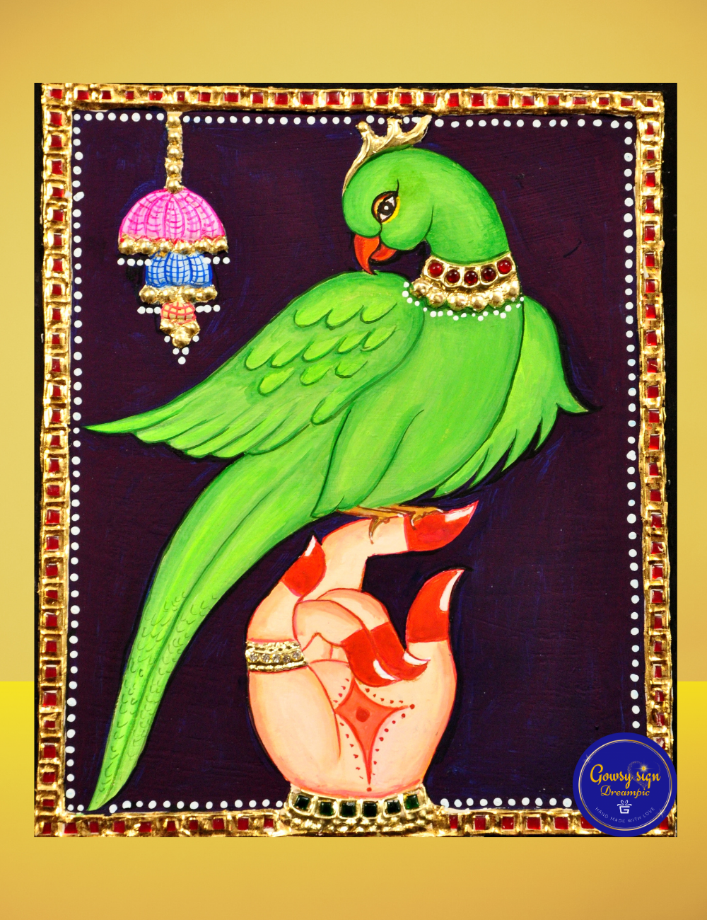 Add a touch of charm and tradition to your space with this elegant Tanjore painting of a single parrot perched in hand — a beautiful representation of grace, communication, and auspicious energy in Indian art.