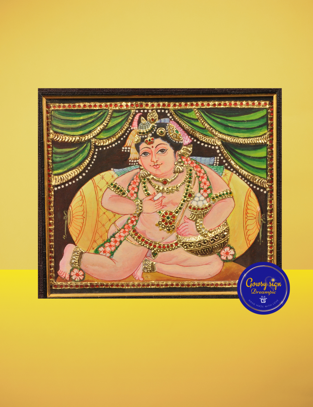 Crafted using traditional Tanjore painting techniques, this artwork features authentic 24k gold foil, rich colors, and embossed detailing. Bala Krishna is shown in a seated posture with a pot of butter or flute, symbolizing divine playfulness and eternal happiness.